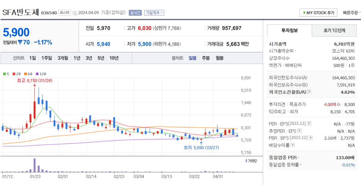 - 이러한 이유로 SFA반도체는 반도체 후공정 관련 테마주로 편입되어 있으며, 앞으로도 지속적인 성장 가능성을 보유하고 있음.