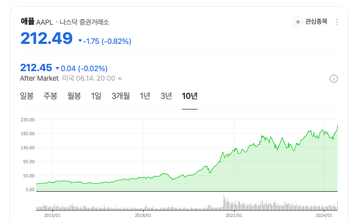 아이폰과 맥북으로 전세계적으로 잘 알려진 미국의 대표적인 IT기업인 애플(AAPL)의 현재 주가는 212.49달러로, 이는 그들의 엄청난 성장을 보여주는 수치입니다.