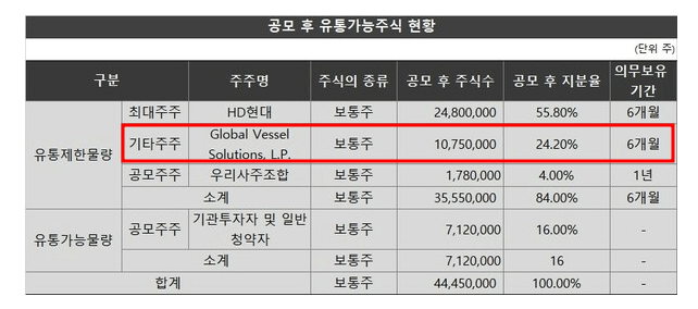KKR(사모펀드)은 2021년에 현대마린솔루션 지분 38%를 6,534억 원에 취득했습니다. 이번 IPO에서 구주매출을 통해 일부를 청산하여 투자금의 절반을 회수했으며 (445만 주를 매각), 남은 주식은 약 1,075만 주 정도입니다. 하지만 이 주식은 의무보유 기간이 6개월이므로 당분간은 시장에 풀리지 않아 걱정하지 않으셔도 됩니다.